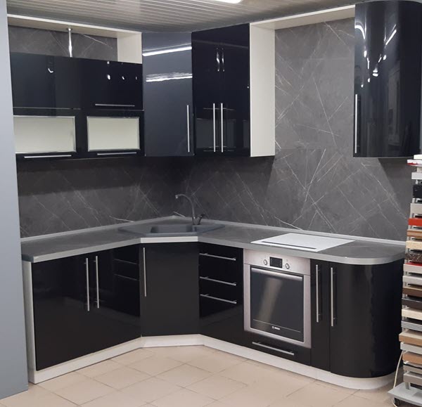 Кухня Мокрый асфальт - антивандальный пластик ADELKREIS 1810*2450 со столешницей и стеновой панелью LIGRON Laminate+ арт4060 Питера Грей с кромкой 3D, с мойкой и смесителем кварц, в цвет столешницы, все механизмы с доводчиками Стоимость со скидкой 110000 руб